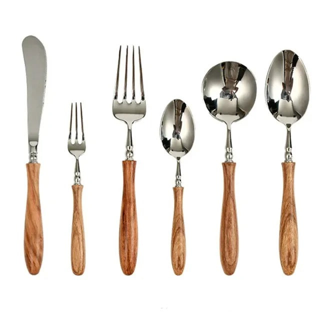 Add elegance and function to your table with this Danaya Cutlery Set featuring smooth wooden handles and a contemporary design. Made from high-quality 18/8 stainless steel, this flatware is durable, corrosion-resistant, and perfect for both everyday meals and special occasions. Its modern curves and natural wood detailing bring a unique touch to any table setting.