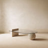 Drawing from Mediterranean architecture and a sense of natural harmony, the design pairs two travertine forms — one spherical, one geometric — beneath a floating glass top that introduces softness and light.