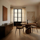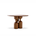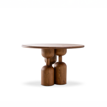 Guided by the relationship between geometry and nature, the Ciela Table stands on three solid wood pillars, each shaped into a smooth, sculptural form. These legs support the circular top with graceful stability, creating a piece that feels both grounded and airy.