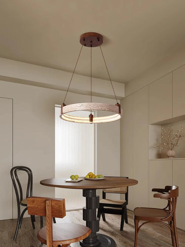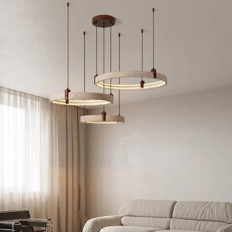 Embrace the art of simplicity with this Wabi-Sabi–inspired chandelier, crafted from natural yellow travertine stone, wood, and iron. Its circular design evokes balance and calm, while the soft LED glow enhances your home with warm, minimalist elegance.