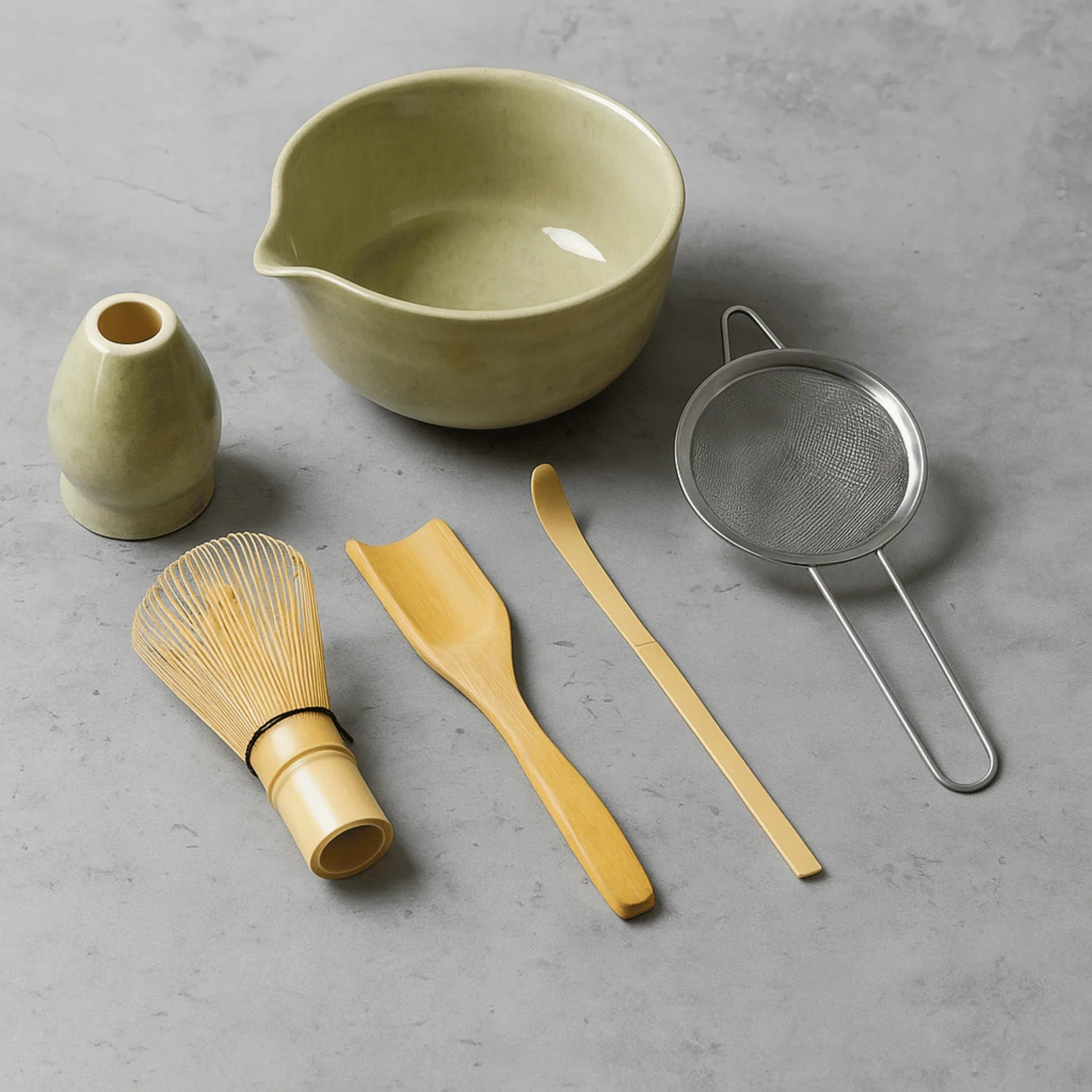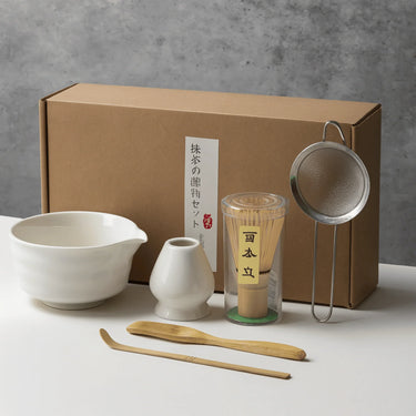- Set Includes: 1 Ceramic Matcha Bowl, 1 Bamboo Whisk (Chasen), 1 Whisk Holder, 1 Bamboo Spoon (Chashaku), 1 Scoop Rest, 1 Sifter