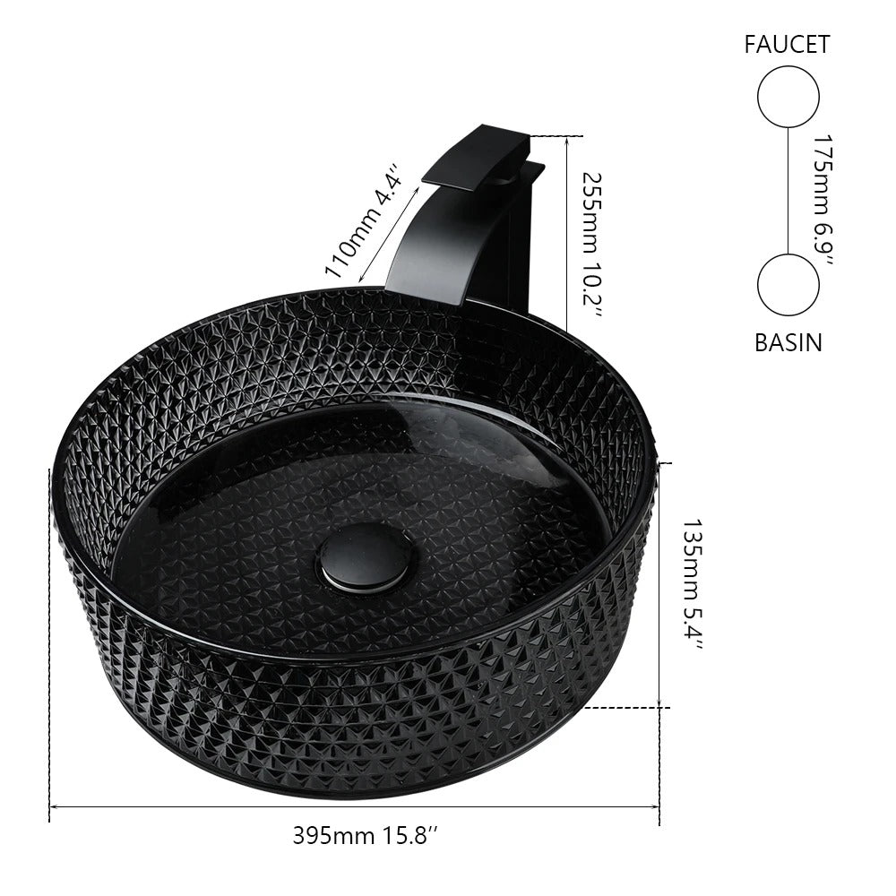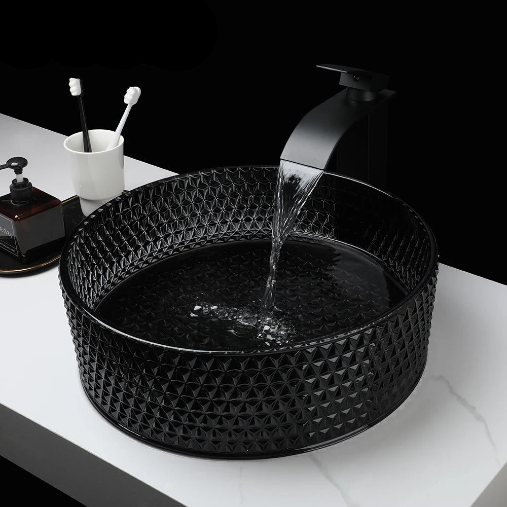 Add a touch of luxury to your bathroom with this elegant Denali Glass Vessel Sink and matching chrome faucet set. Featuring a hand-painted finish and crafted from durable tempered glass, this sink combines modern style with lasting performance. Its round design sits beautifully above the counter, making it a standout centerpiece for any vanity. The included pop-up drain and installation accessories ensure a quick and hassle-free setup. Ideal for contemporary bathrooms, salons, or stylish guest spaces.