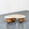 Each table is masterfully handcrafted, with travertine chosen for its natural veining and sculpted to highlight its organic character. The ash wood legs are expertly turned and polished into smooth spheres, offering both sculptural beauty and structural strength.