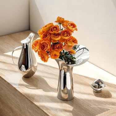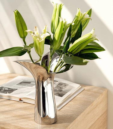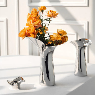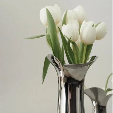 Add a touch of modern elegance to your space with this Saun Vase. Its sleek trumpet silhouette and reflective finish create a striking focal point for floral arrangements or as a standalone piece. Perfect for contemporary interiors, this vase blends luxury with simplicity, making it ideal for coffee tables, shelves, or centerpieces.